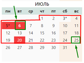По примеру выше на период с 1 по 25 июля выпадает 15 рабочих дней, которые и будут оплачиваться.