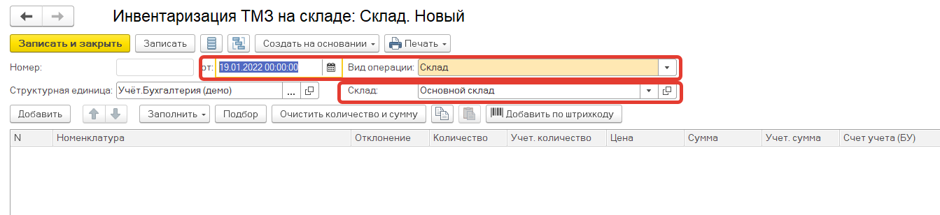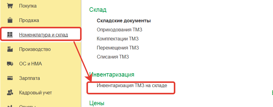 Инвентаризация ТМЗ на складе доступна в разделе Номенклатура и склад-Инвентаризация-Инвентаризация ТМЗ на складе.