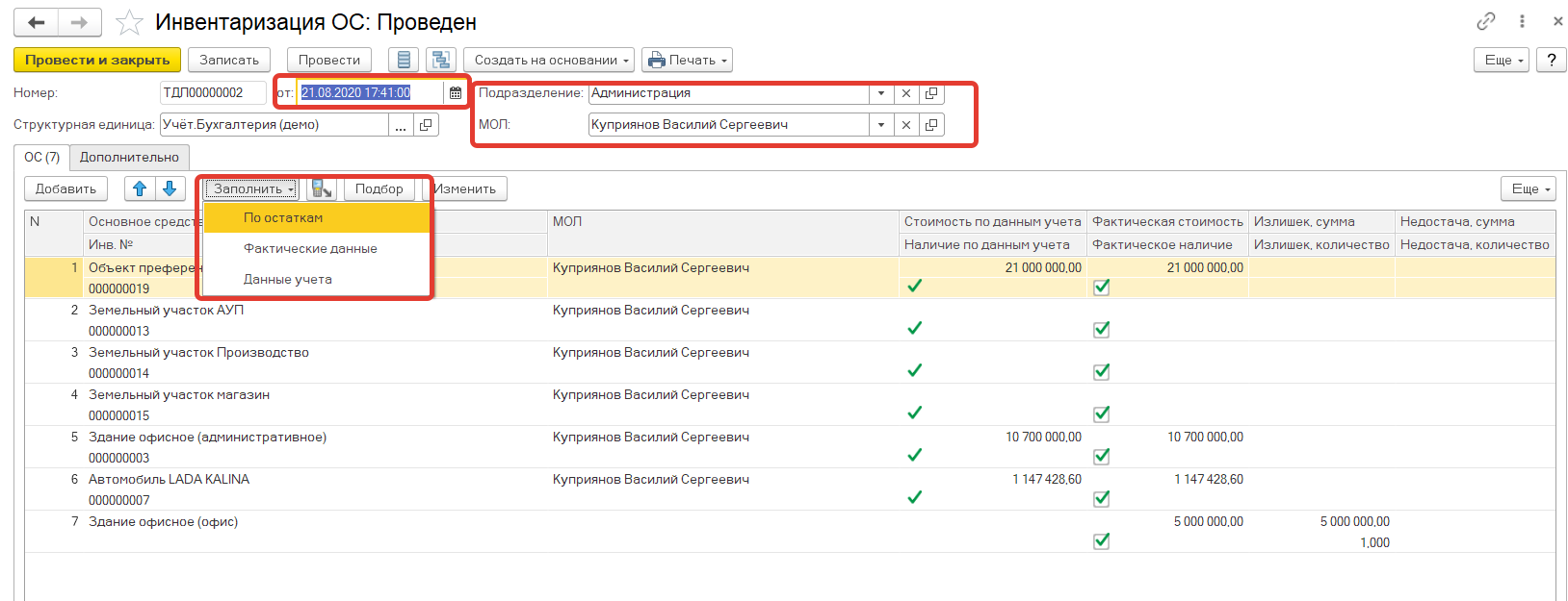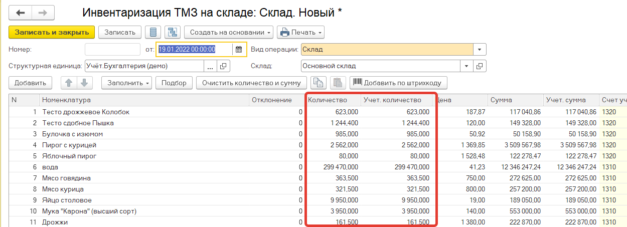 На основании подсчета выполняется заполнение данных фактического учета и сверка с данными бухгалтерского учета.