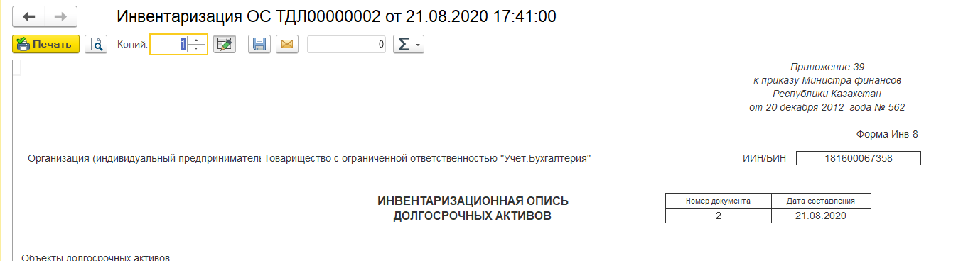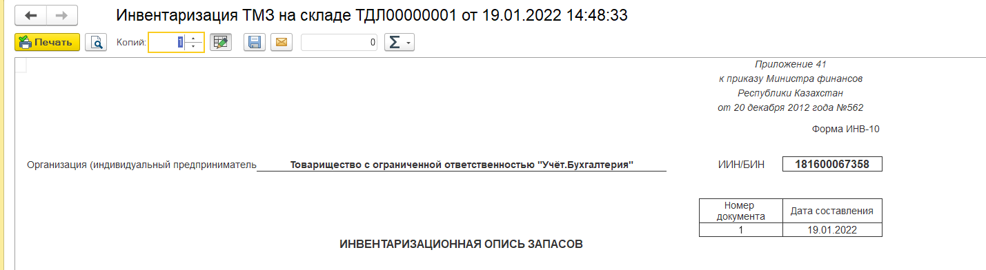 После того как инвентаризационная опись была составлена, документ выводится на печать.