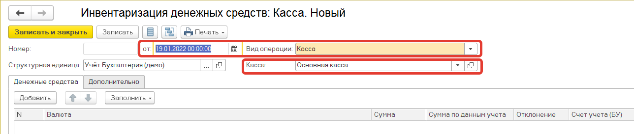 В случае если инвентаризация проводится только денежных средств в кассе, выбираем вид операции - Касса.