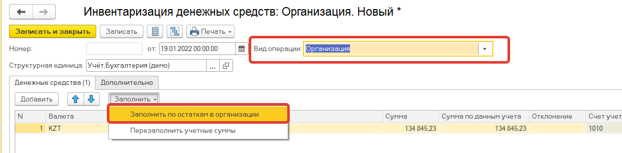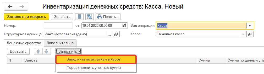 Нажав на кнопку заполнить, выполняется заполнение всех счетов связанных учета денежных средств.