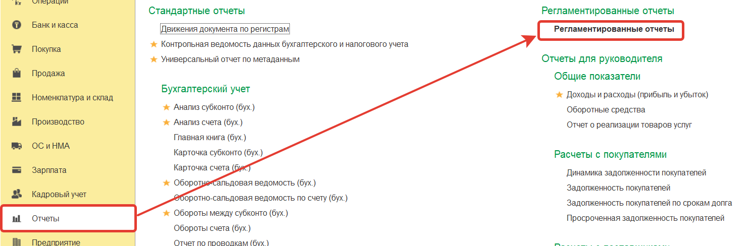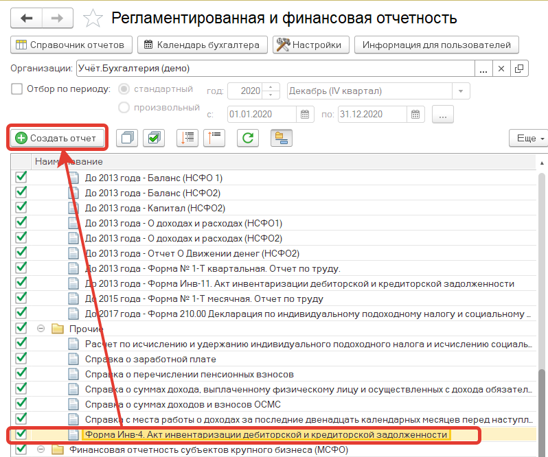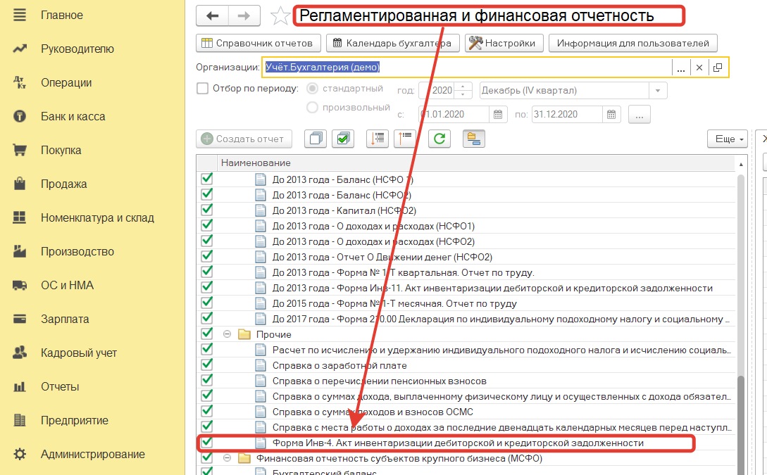 Открыть акт инвентаризации дебиторской и кредиторской задолженности можно в разделе Отчеты-регламентированные отчеты