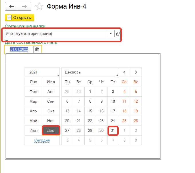 Выбираем организацию и дату выведения отчета. В нашем примере 31.12.2021 года.