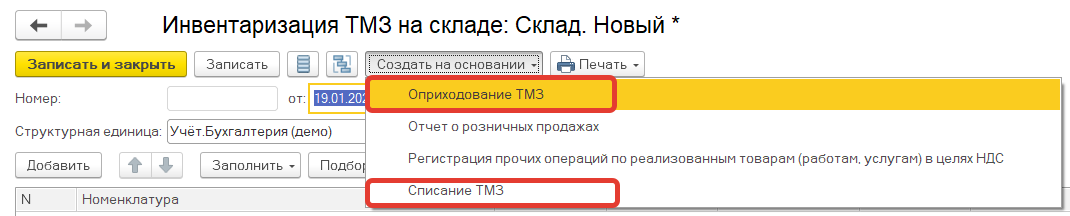 В том случае, если были выявлены излишки или недостачи, на основании инвентаризации могут быть созданы документы списания ТМЗ и Оприходования ТМЗ