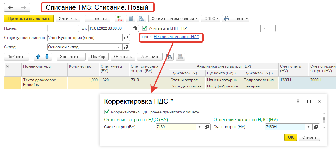 При необходимости в документе Списание ТМЗ можно выполнить корректировку зачетного НДС. Такая корректировка выполняется в соответствии со статьей 404 НК РК.