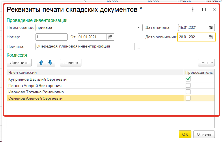 Обязательно заполняем, на основании чего проводится инвентаризация, № и дата, срок проведения, члены комиссии