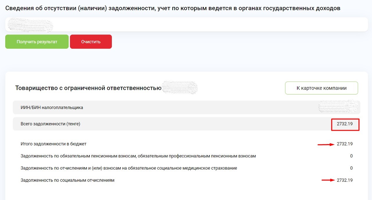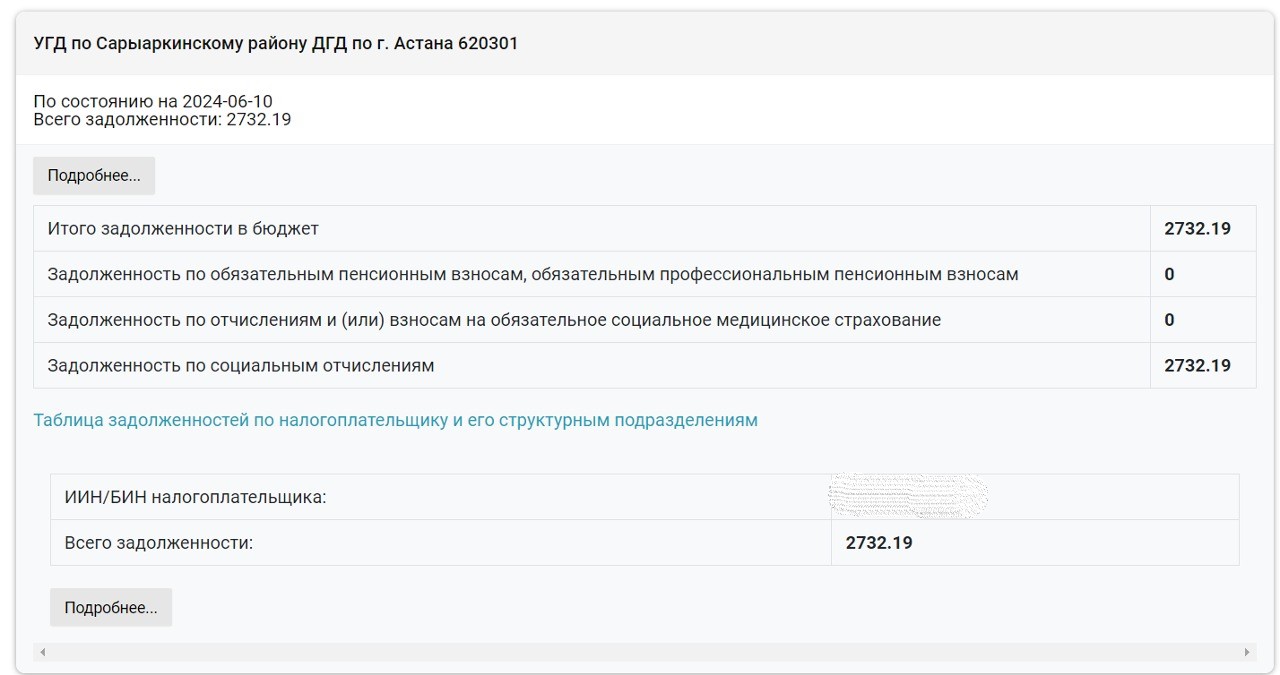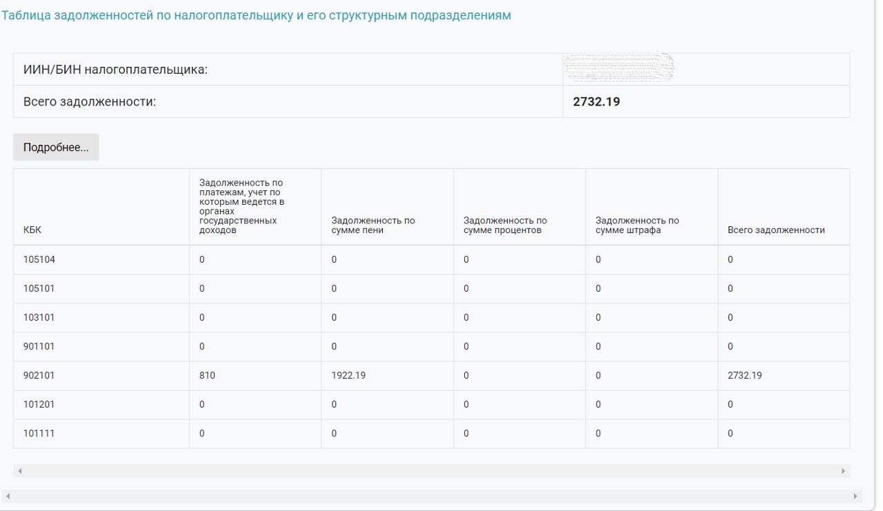 Вводим БИН компании, в разделе "Задолженность по налогам и таможенным платежам" или "Сведения о задолженности, учет по которым ведется в органах государственных доходов" нажимаем кнопку "Подробнее"