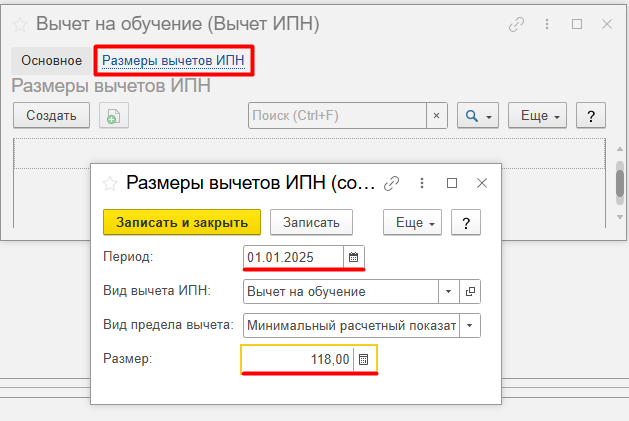 5. Переходим во вкладку Размеры вычетов ИПН, нажимаем на кнопку Создать. Указываем Период: 01.01.2025, Размер: 118 МРП. Записать и закрыть.