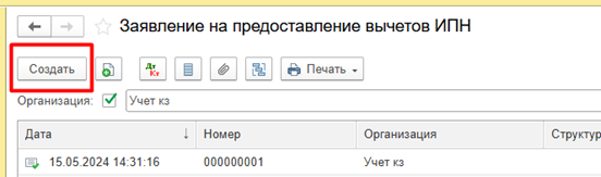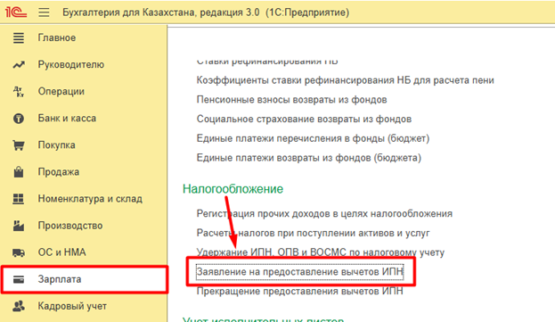 1. Открываем раздел Зарплата, подраздел Налогообложение - Заявление на предоставление вычетов ИПН: