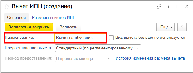 4. Пишем наименование: Вычет на обучение. Нажимаем на кнопку Записать: