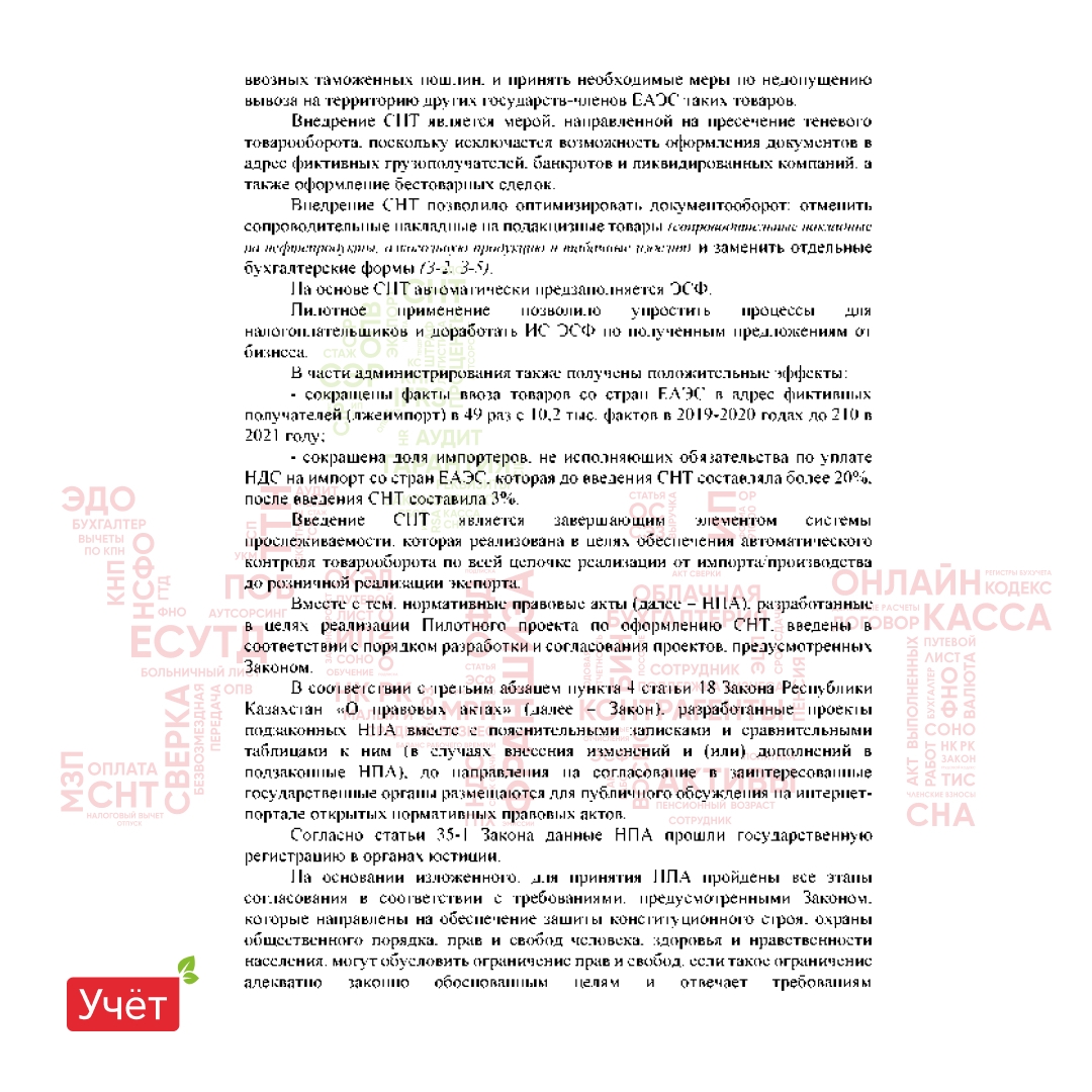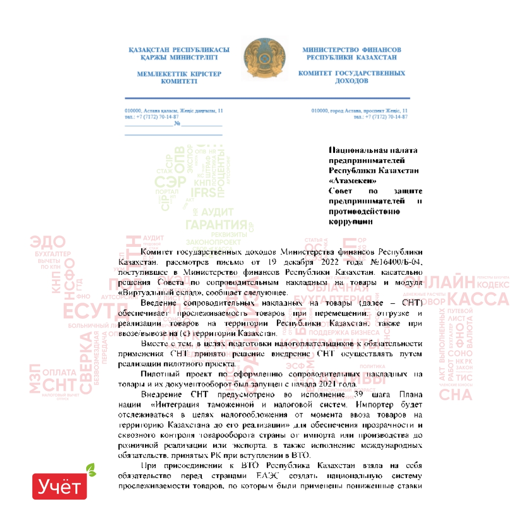 «Введение сопроводительных накладных на товары (далее – СНТ) обеспечивает прослеживаемость товаров при перемещении, отгрузке и реализации товаров на территории Республики Казахстан, также при ввозе/вывозе на (с) территории Казахстан.