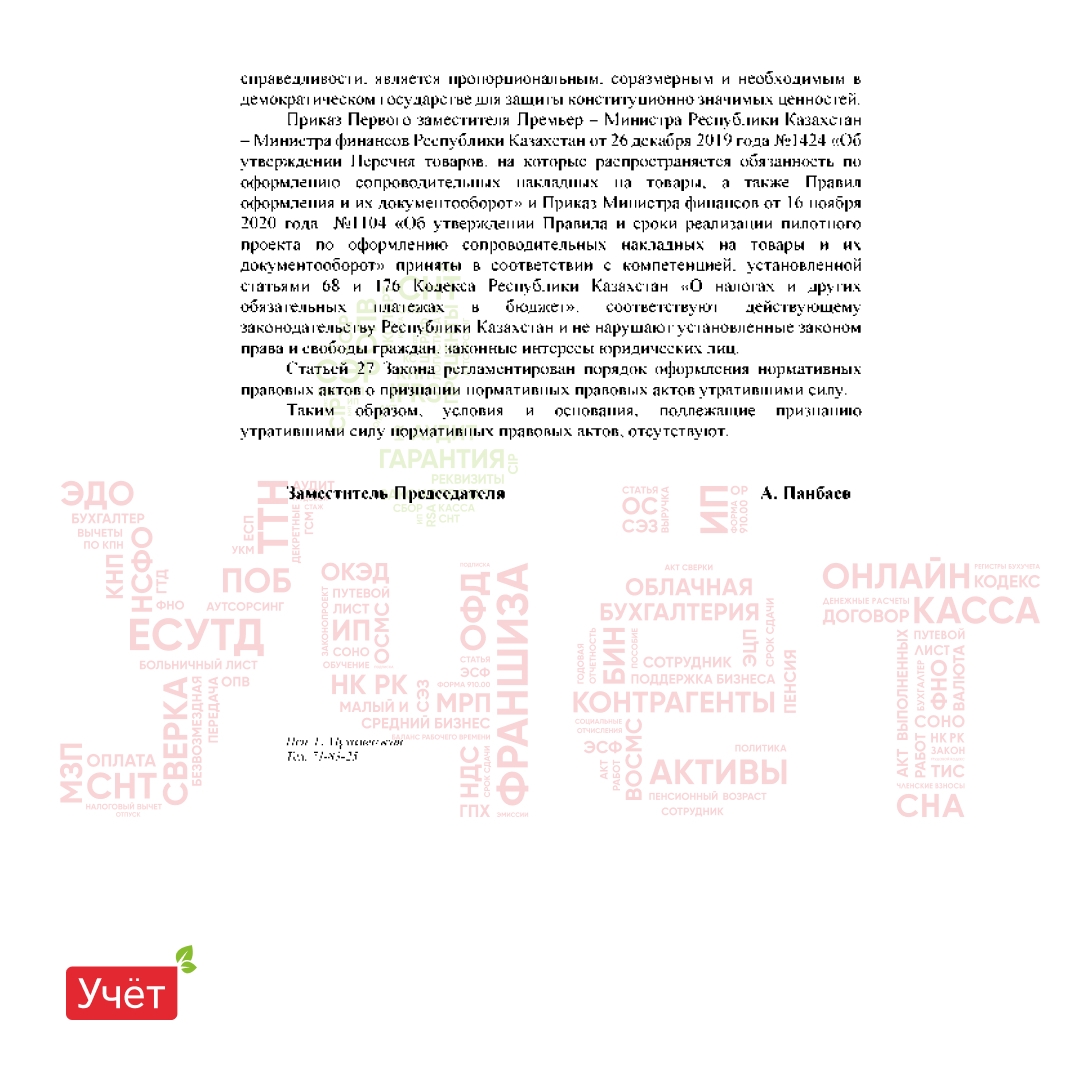 Приказ Первого заместителя Премьер – Министра Республики Казахстан – Министра финансов Республики Казахстан от 26 декабря 2019 года №1424 «Об утверждении Перечня товаров, на которые распространяется обязанность по оформлению сопроводительных накладных на товары, а также Правил оформления и их документооборот» и Приказ Министра финансов от 16 ноября 2020 года №1104 «Об утверждении Правила и сроки реализации пилотного проекта по оформлению сопроводительных накладных на товары и их документооборот» приняты в соответствии с компетенцией, установленной статьями 68 и 176 Кодекса Республики Казахстан «О налогах и других обязательных платежах в бюджет», соответствуют действующему законодательству Республики Казахстан и не нарушают установленные законом права и свободы граждан, законные интересы юридических лиц.