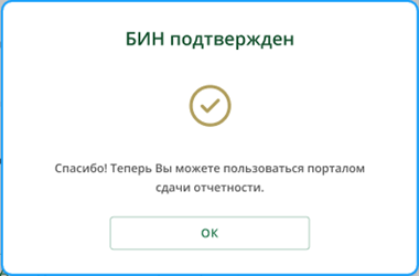 В случае успешного заполнения регистрационных данных и успешной процедуры подписания ЭЦП на Портале будет отображаться сообщение об успешном подтверждении БИН.