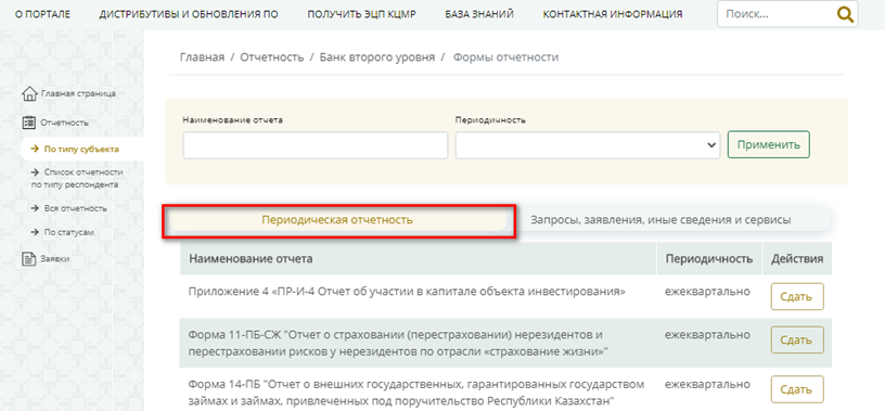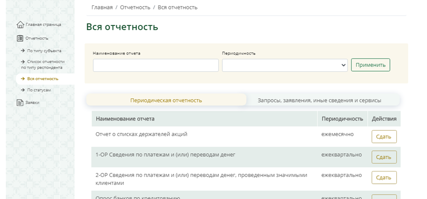 В каждом из представлений, тем или иным образом отображается список отчетности, настроенные для соответствующего типа субъекта, каким является авторизовавшийся пользователь, кроме представления «Вся отчетность», которая отображает всю отчетность Национального Банка РК, заведенную в Портале.