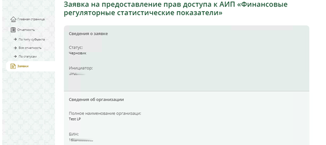 Рисунок 26. Заявка на предоставление доступа к автоматизированной информационной подсистеме «Финансовые регуляторные статистические показатели».