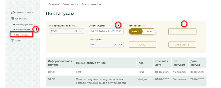 Данный раздел предназначен для отображения статусов по отчетам, сформированным в автоматизированной информационной подсистеме «Финансовые регуляторные статистические показатели».