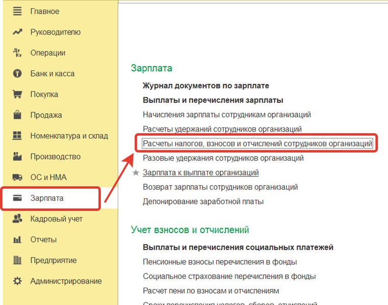 3 Шаг Расчет налогов взносов и Отчислений. Меню Зарплата - Расчеты налогов, взносов и отчислений: