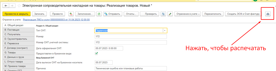 Чтобы распечатать заполненную СНТ на бумажном носителе, необходимо нажать на кнопку Печать: