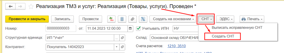 Для выписки СНТ на бумажном носителе необходимо открыть соответствующий документ Реализации (перемещения или поступления) и на основании этого документа создать СНТ: