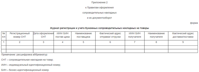 При оформлении СНТ на бумажных носителях поставщик (при ввозе – получатель) ведет Журнал регистрации и учета бумажных сопроводительных накладных на товары по форме согласно приложению 2 к Правилам оформления СНТ: