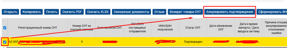 Чтобы выполнить аннулирование подтверждения СНТ, необходимо Аннулировать подтверждение.