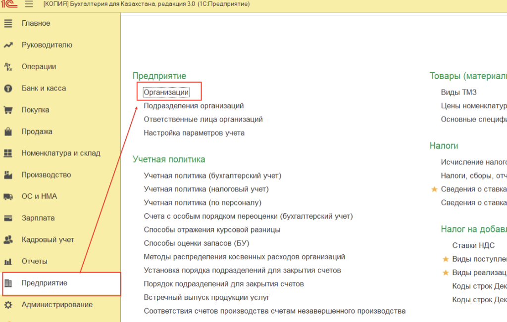 2. Переход в раздел "Организации": В главном меню выберите раздел "Предприятие" -> "Справочники" -> "Организации":