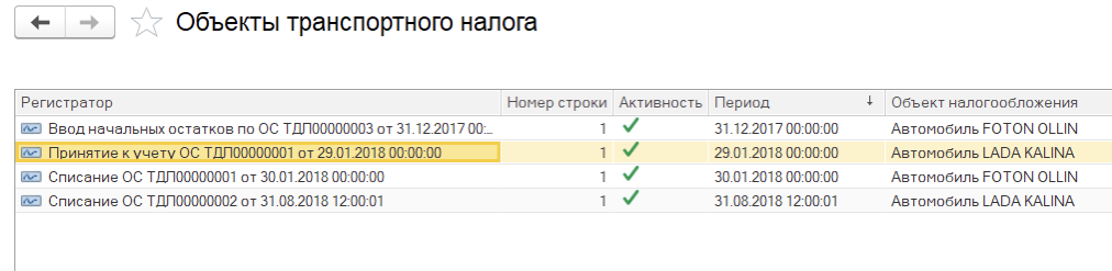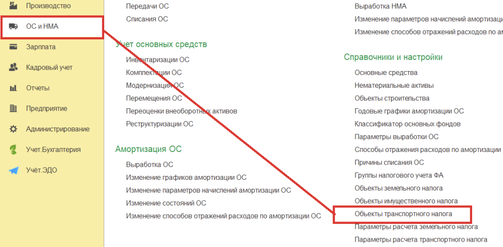 Основные средства, являющиеся объектами обложения налога на транспортные средства, отображаются в регистре сведений Объекты транспортного налога (раздел ОС и НМА - Справочники и настройки - Объекты транспортного налога):