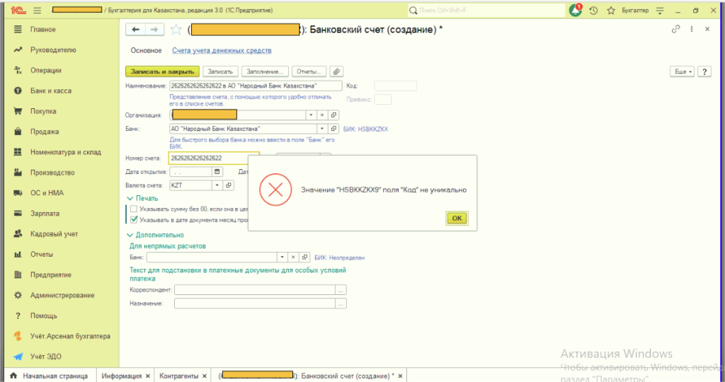 При создании банковского счета в карточке контрагента если выходит ошибка значение "Код" не уникально- значит сбилась нумерация в справочнике "Банковские счета".