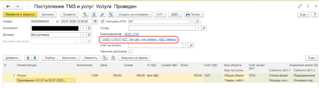 1. В документе Поступление ТМЗ и услуг указывается курс доллара по курсу Нацбанка (см.скрин):