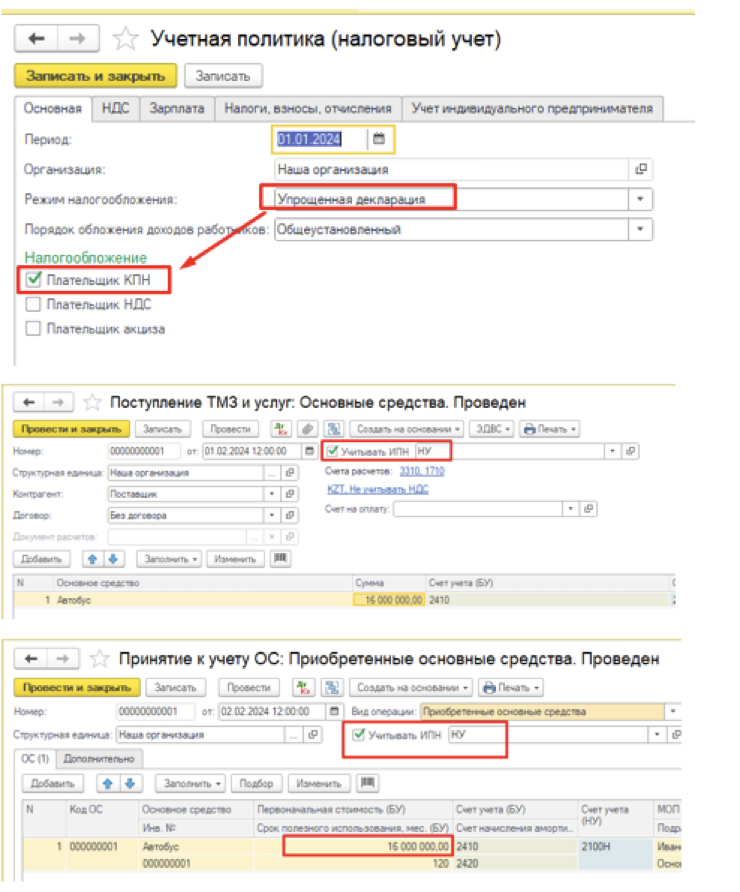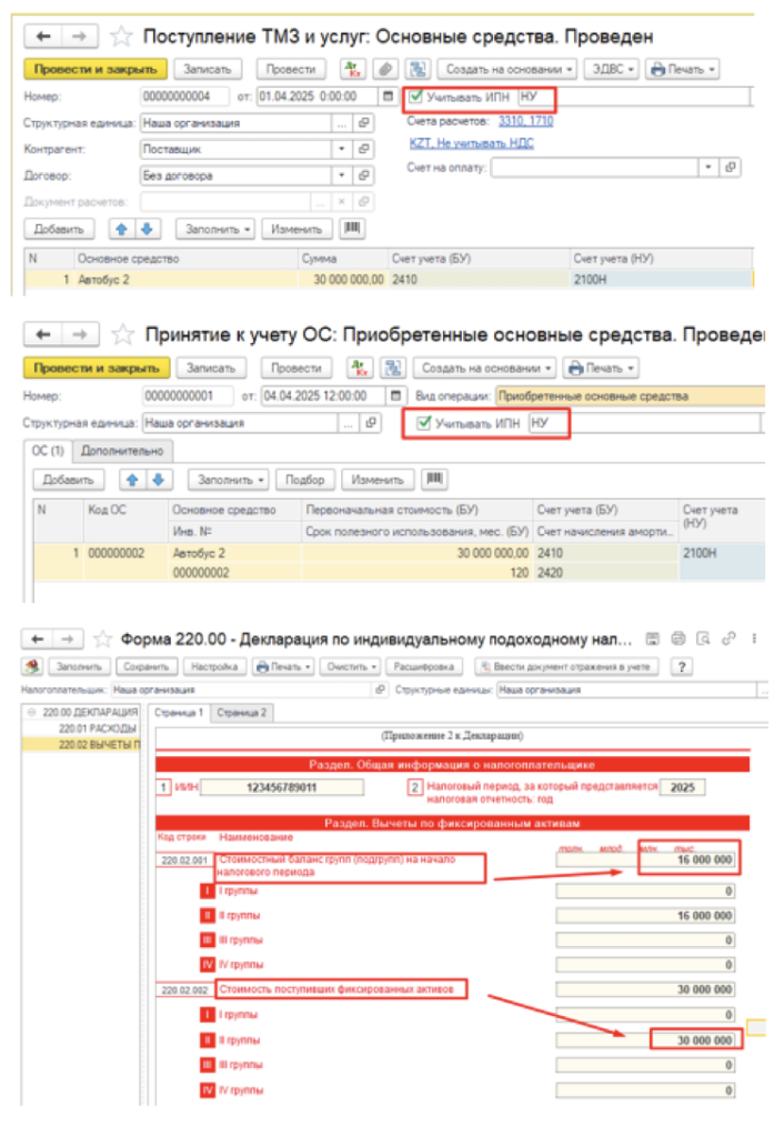 ИП в 1 квартале 2025 года был на упрощенном режиме. 21.01.2025 г. приобрел автобус на сумму 16,0 млн. тенге и в 1С заполнил «Принятие к учету ОС» (галочка «Учитывать ИПН НУ» отсутствует). С 1 апреля 2025 года перешел на ОУР. 29.05.2025 г. приобрел еще автобус на 30,0 млн. тенге. При формировании 220.02 формы в стоимости поступивших ФА отражается 30,0 млн. тенге.