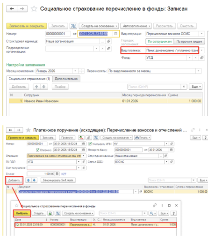 Для корректного отражения ошибочно перечисленной пени по ВОСМС в программе 1С, необходимо выполнить следующие:
