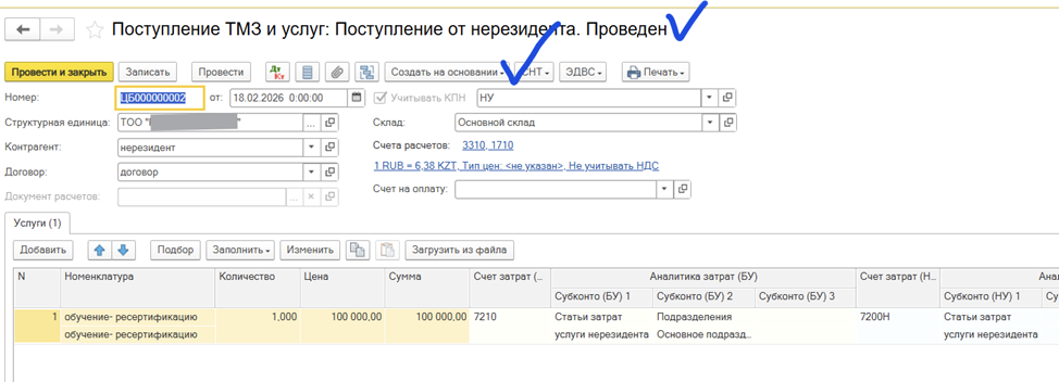 Как в 1С посадить поступление услуги, чтобы данная сумма корректно отобразилась в ФНО 300.00?