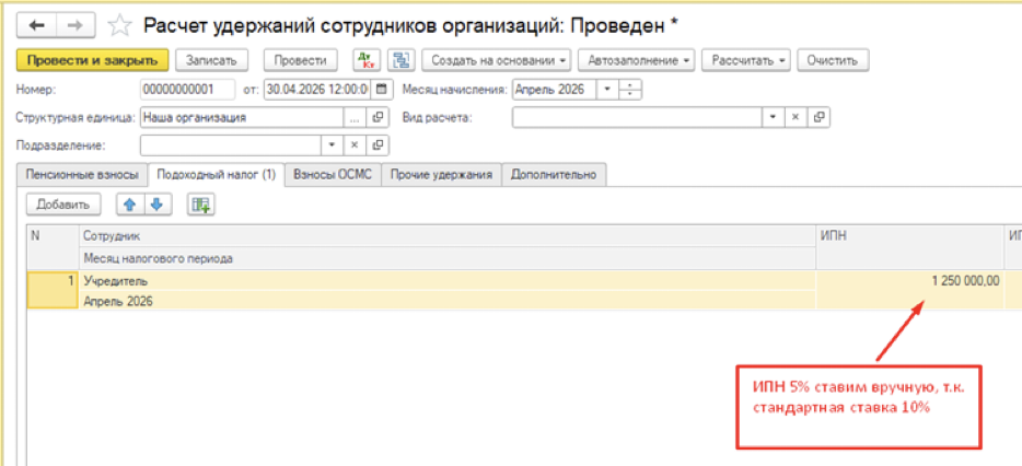 Как провести начисление дивидендов в 1С, где налог ИПН 5%, так как сумма не больше 230 000 МРП, в 1С автоматом считает ИПН 10%?