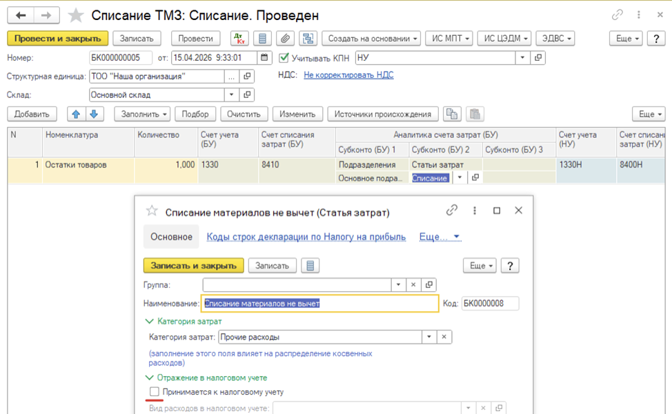 1. Вариант. ТМЗ были оприходованы на склад без отметки режима СНР. В таком случае при списании необходимо указать субконто затрат ПР, не относимый на вычет. В таком случае ТМЗ СНР можно списывать одним документом с ТМЗ, ОУР: