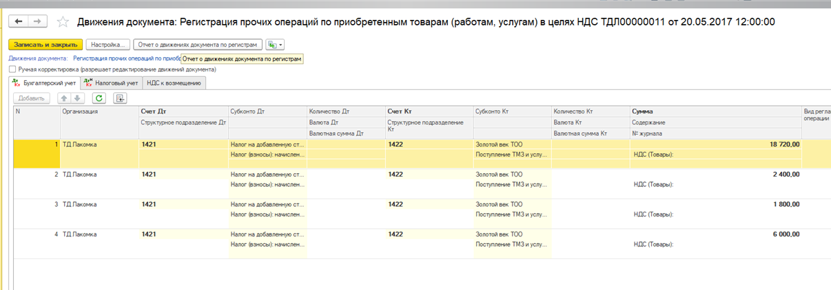 При внесении остатков у Вас сумма НДС с данного ЭСФ будет висеть как «отложенный НДС». В программе 1С 8.3 вводите ЭСФ (ЭСФ проводок не даёт, поэтому задвоение не грозит) и вводите документ «Регистрация прочих операций. Регистрация оборота» (данный документ даёт проводки только по отнесению НДС в зачет).