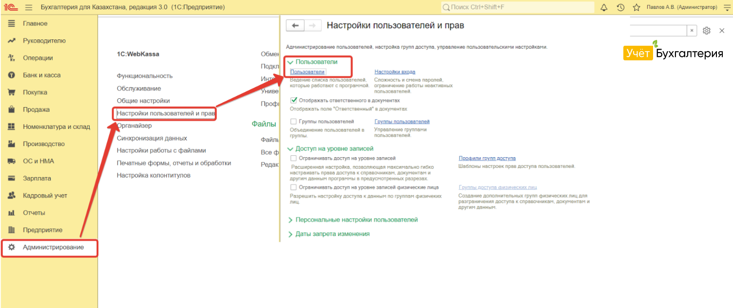 В меню Администрирование- в разделе «Настройки пользователей и прав»- «Пользователи» открыть карточку пользователя,...