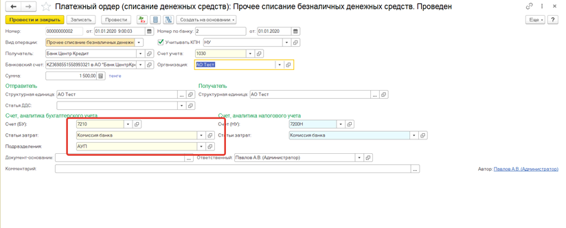 Нужно изменить списком документов счет, аналитику бухгалтерского учета на 3310, а также указать контрагента. Открываем меню «Банк и касса - Платежные ордера (списание денежных средств)».