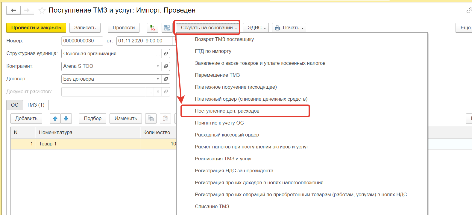 На основании документа «Поступление ТМЗ и услуг» с видом операции «Импорт» необходимо ввести документ «Поступление доп. расходов».