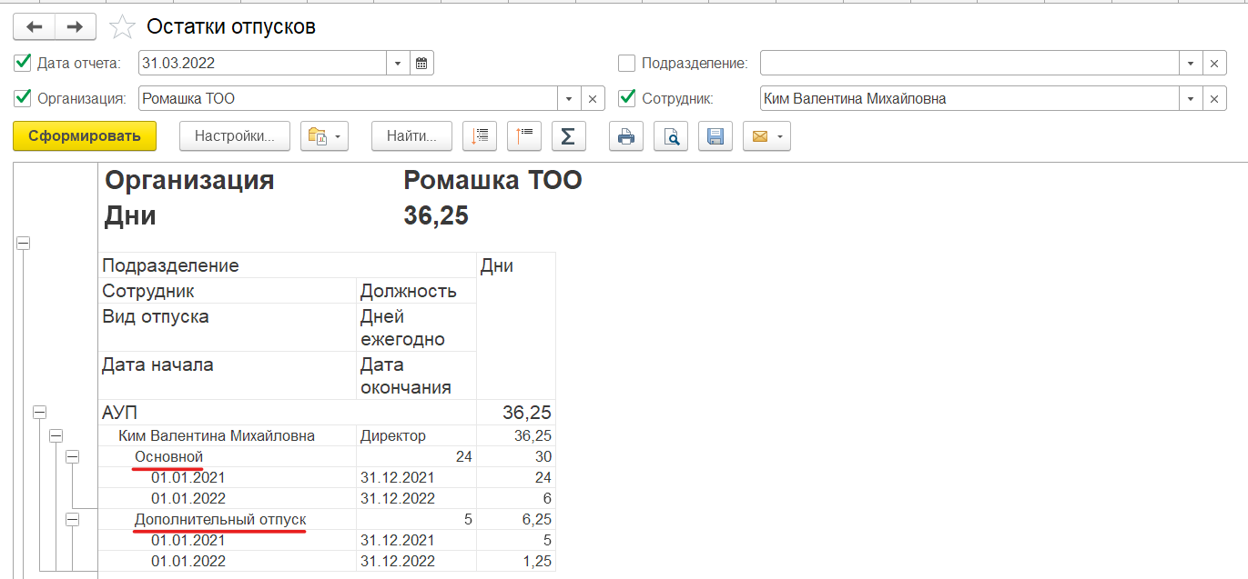 Для просмотра остатка накопленных дней отпуска, в программе необходимо сформировать отчет «Остатки отпусков».