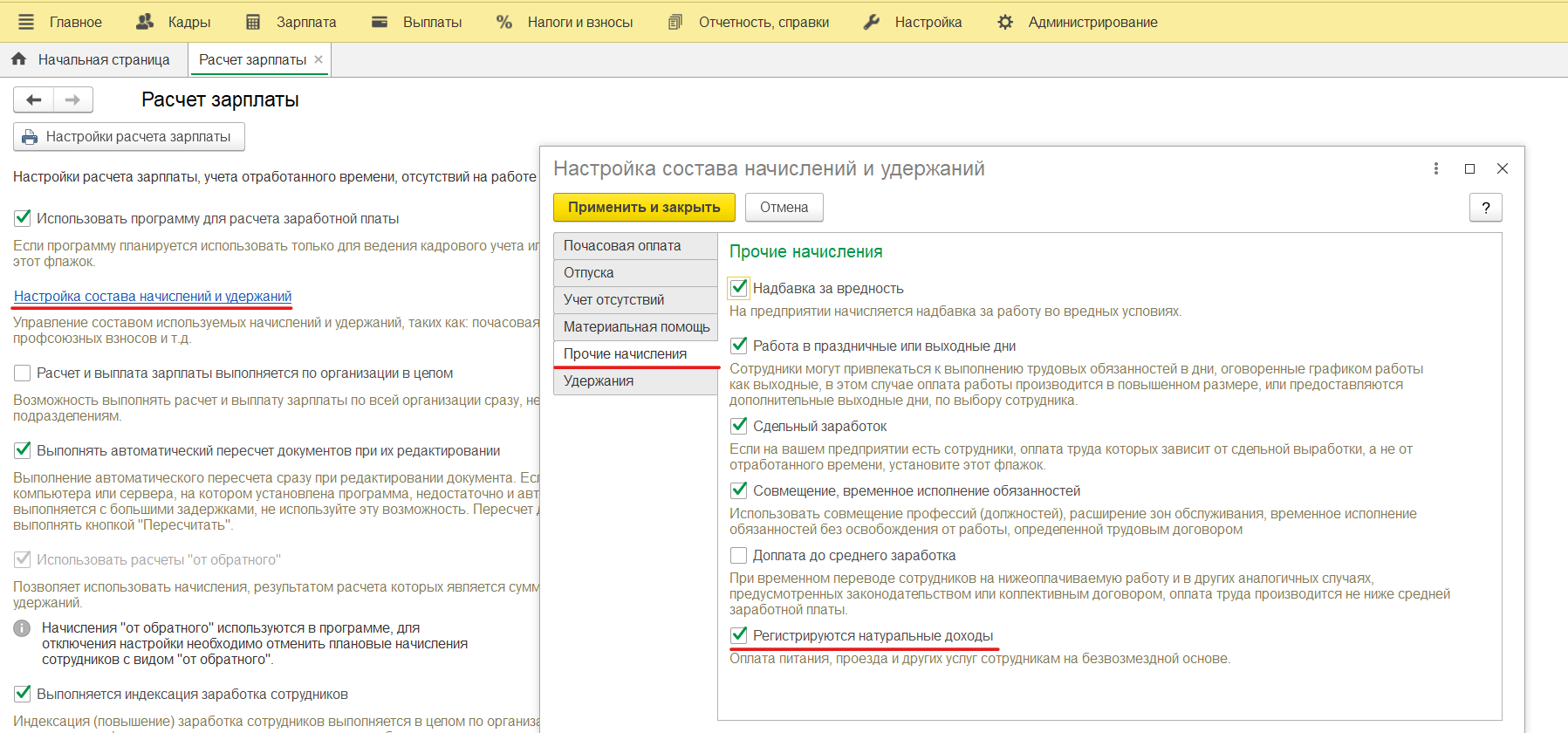 Для регистрации дохода в натуральной форме, необходимо перейти в меню «Настройка»- «Расчет зарплаты»- «Настройка состава начислений и удержаний»- на закладке «Прочие начисления» установить галочку «Регистрируются натуральные доходы».