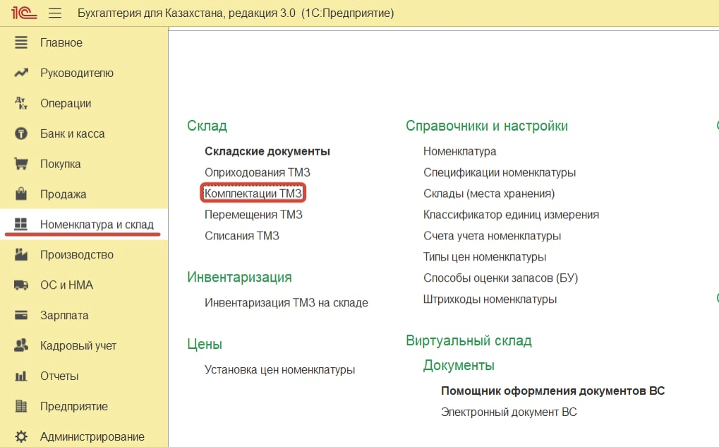 Разукомплектация - вид операции, предназначенный для списания комплекта со склада и оприходования на склад комплектующих, полученных от разукомплектации. Для того чтобы отразить операцию Разукомплектация, необходимо открыть документ "Комплектация ТМЗ", который расположен в меню Номенклатура и склад в разделе Склад - Комплектация ТМЗ: