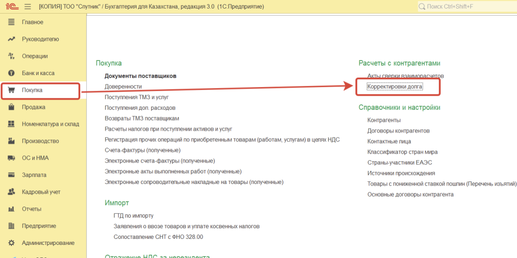 В данном случае возникла дебиторская задолженность поставщика, поэтому мы выбираем операцию Закрытие дебиторской задолженности. Для списания дебиторской задолженности поставщика перед вами в программе 1С есть документ "Корректировка долга", который находится в меню Покупка, в разделе Расчеты с контрагентами:
