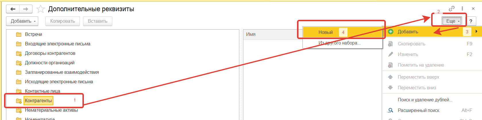 Откроется раздел справочников, в которых мы можем выполнить добавление новых реквизитов. В нашем случае нужен дополнительный реквизит в справочнике контрагента.