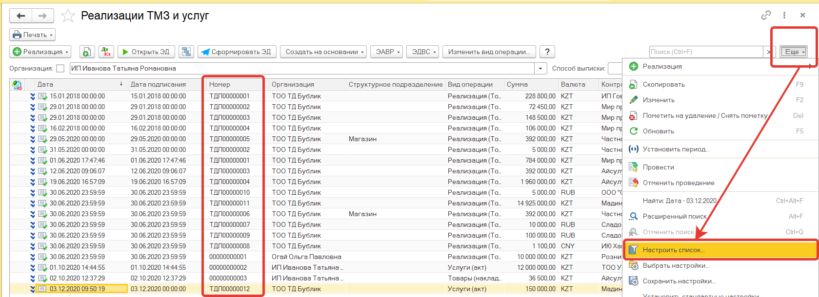 Для этого в журнале реализации можем выполнить настройку подсветки по номеру документа.