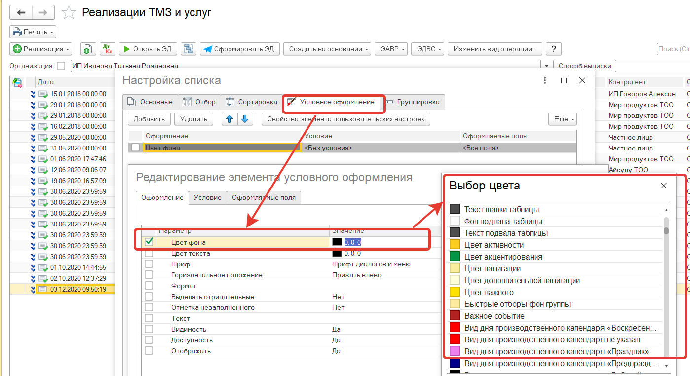 После заполнения дополнительного реквизита по всем контрагентам, можем выполнить настройку журнала реализации по цветовому отображению.