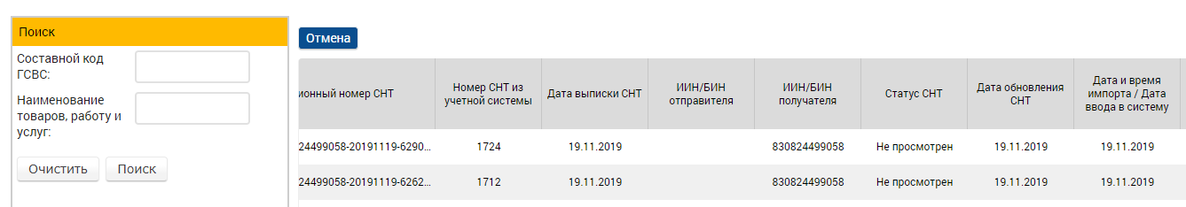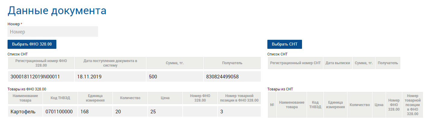 Прием форм налоговой отчетности (328.00) осуществляется в автоматическом режиме из ИС ЕХД. В WEB-портале ИС ЭСФ пользователю, в чей адрес поступила ФНО 328.00, в ручном режиме необходимо сопоставить данные по товарам из импортной СНТ с ФНО 328.00.