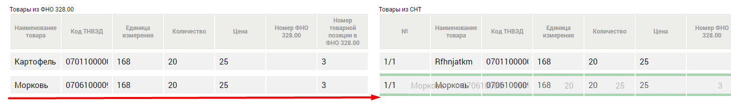 14. Для сопоставления товаров нужно построчно перетащить данные с ФНО 328.00 в СНТ, потянув за левый угол строки мышью, так чтобы строка из ФНО 328.00 накладывалась сверху на строку из СНТ.
