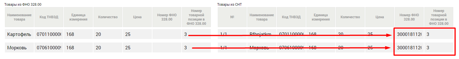 При сопоставлении строк СНТ и ФНО 328.00 производится идентификация полей: