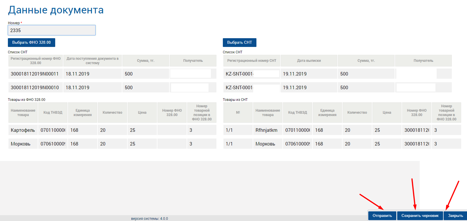 16. Полностью заполненную Форму Сопоставление СНТ и ФНО 328.00 можно «Отправить», «Сохранить, как черновик», «Закрыть».